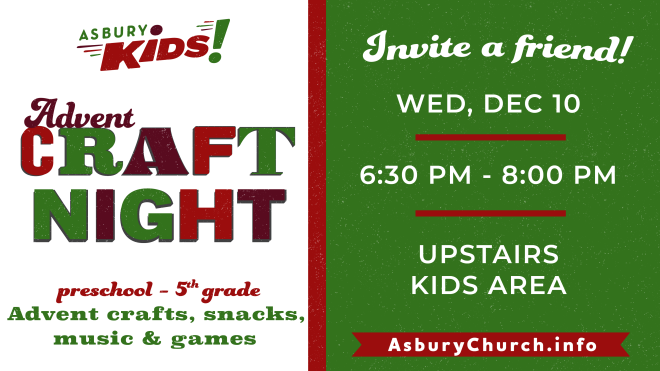 Join Us for an Advent Craft Night! Bring the kids for a fun-filled evening of creativity of Advent inspired crafts, snacks, music, and games.